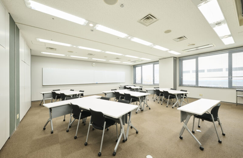 100㎡の会議室Eは、研修や会議をするにあたって汎用性があり最ニーズの高い会議室です。20~30名様でのご利用が多く、使い勝手のよい大きさです。